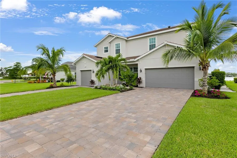 Here is your opportunity to own this beautiful like-new home in Vista Wildblue, a wonderful new boating community. One of the best priced homes on the lake with pool and dock! This must-see house features gorgeous lake views on an oversized lot with desirable western exposure to enjoy the best sunsets on your brand new private dock. With over 3,400 square feet of living space this gem offers five bedrooms (one bedroom on the ground floor with en suite) plus a loft, four and a half bathrooms, pool, spa, three-car garage and more. So many upgrades and features that will make the most discerning buyers happy such as plantation shutters, 20" ceilings with exposed custom wood beams, quartz countertops, upgraded appliances, 2 brand new AC units (1 year old), upgraded electrical panel, new landscape and more, so much value for the money! Located in Vista Wildblue, just minutes from the best shopping and dining, hospitals, FGCU and the SWFL International Airport! Bring the family, entertain, have fun on the lake, live Florida at its best!