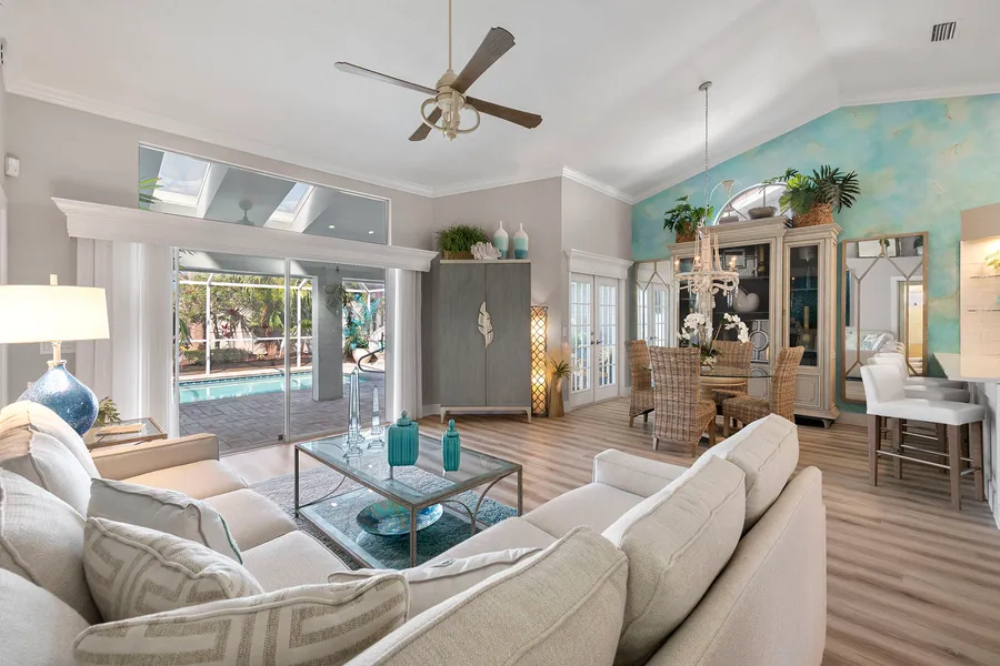 Enjoy an abundance of natural light through large windows and skylights from this beautiful pool home in the popular Kelly Greens Golf & Country Club community. Completely updated, this home has been wonderfully decorated including custom window treatments in each room. New flooring flows through the well-designed open floor plan with a large, stunning kitchen featuring a breakfast bar, new cabinetry, countertops, and appliances as well as a sitting area in the bay window, perfect for a morning cup of coffee. The open dining area is warm and inviting, and the large living room overlooks the pool and is great for entertaining. Both baths are fantastic, and the large master bath is a work of art with large walk-in shower, with the master closet featuring custom shelving. Finally, the lanai and pool area features various sitting areas, skylights and the security of hurricane shutters. Conveniently located to the beach and entertainment, this gated community offers an 18-hole golf course, tennis, a beautiful country club and a wonderful social scene.