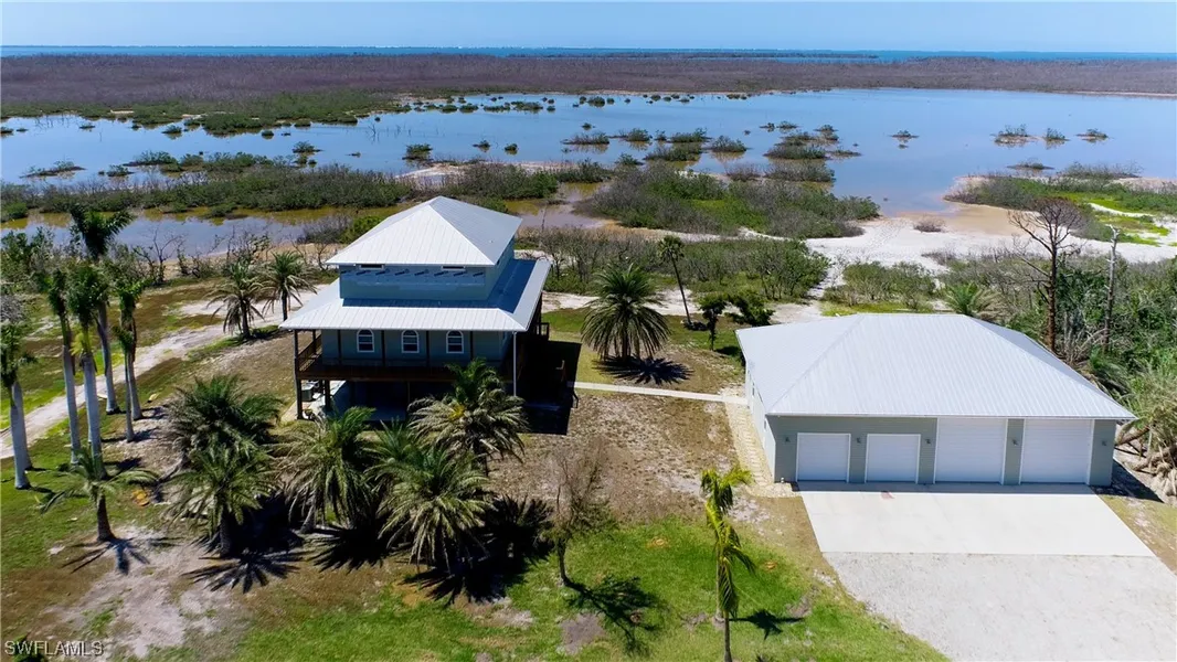 A very unique Home on a Very Unique property !! 3 story home and a 2400 sq ft garage overlooking 10+ acre property with pond (full of blue crabs) and shallow salt water bay perfect for bird and animal watching. Very private, peaceful and secluded from the "outside world" The wood framed Garage is huge... cars, RV's, shop, storage all on cement slab. 3 Story Home - Ground floor is being used as a exercise room the 2nd floor has living, Beautiful kitchen, 2 bedrooms and wrap-around screened Porch..VIEWS ... 3rd Floor is a Master suite with large closet and beautiful bath with separate Shower, Tub and dual sinks, large sitting or den area and master bedroom with sliders to the balcony and views from Sanibel to Boca Grande !!! This is a one-of-a-kind home .. A must to see.