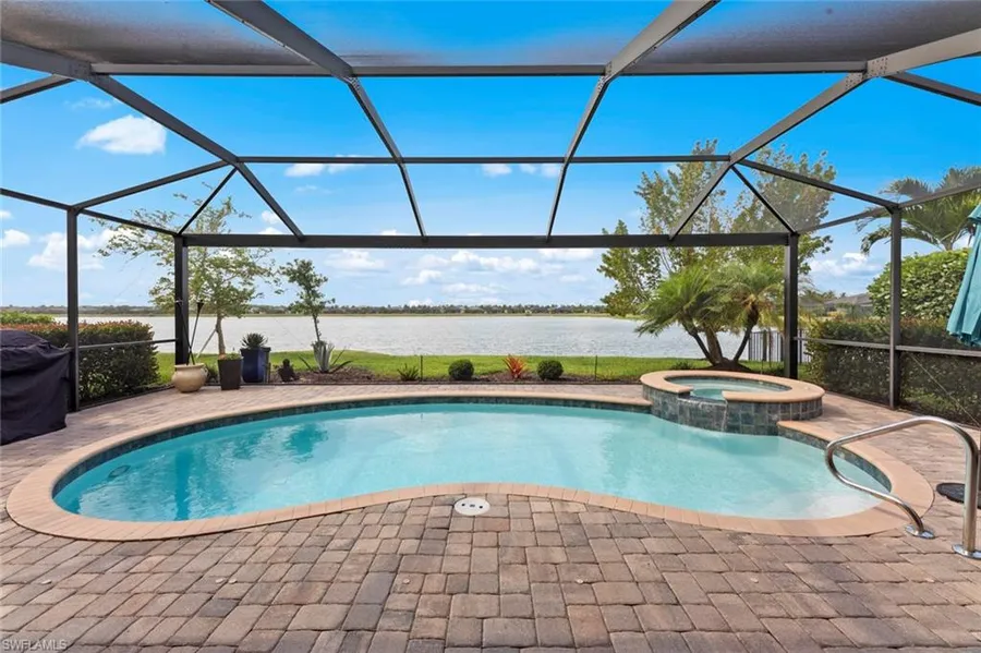 Welcome to your dream home in the highly sought-after, gated community of BONITA LANDING! Enjoy tranquil mornings and serene evenings with your UNOBSTRUCTED SOUTH FACING LAKEFRONT VIEW! THIS IS ONE OF THE NICEST VIEWS IN THE COMMUNITY. Relax in your HEATED POOL and SPA while enjoying the recently upgraded INFINITY PANORAMIC screen which perfectly frames your outdoor living space. The pristine 40 ACRE lake is stocked with fish and complete with a community fishing dock and a fishing pier which makes the perfect place to call home. Step inside to discover the coveted OPEN CONCEPT Lennar Princeton model boasting 4 Bedrooms and 2 Bathrooms. UPGRADED DESIGNER PLANK TILE FLOORING throughout, elegant COFFERED BEAM CEILINGS, CROWN MOLDINGS, and a MODERN FIREPLACE compliment the luxurious home. The updated kitchen is a chef's dream with top-of-the-line appliances, ample granite countertops, and beautiful 42" cabinetry. Four large bedrooms with oversized closets ensure plenty of room for family and guests. Updated laundry room and a spacious THREE CAR GARAGE provides ample storage and parking.This home can be sold fully furnished, making it move-in ready for your convenience and comfort. Bonita Landing offers a plethora of amenities, including fishing docks, tennis courts with Pickleball , a playground, and excellent schools nearby. LOW HOA fees include lawn maintenance, internet, cable and irrigation. THE COMMUNITY IS NOT IN A FLOOD ZONE and the home includes hurricane shutters to ensure piece of mind during inclement weather. Conveniently located close to SWFL's beautiful beaches, top Golf courses, the NEW MIDTOWN BONITA complex featuring dining and shopping. RSW airport and Naples are minutes away. Don't miss your chance to own a piece of paradise in one of Southwest Florida's best neighborhoods. Schedule your private tour today and see firsthand why this property is the perfect place to call home!