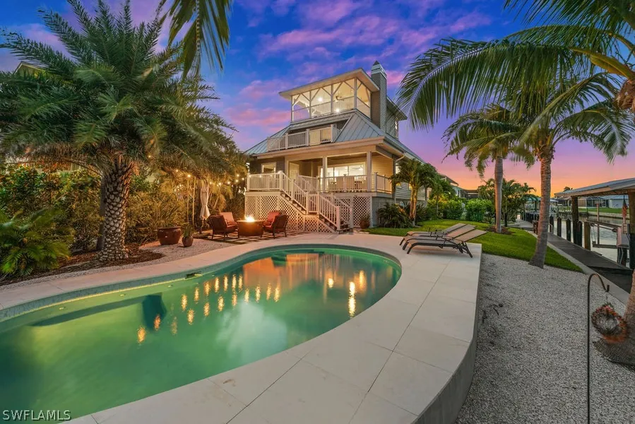 Welcome to your dream home, a luxurious haven where indoor elegance seamless flows with an enchanting tropical outdoor oasis, nestled in the St James City. Delight in a chefs dream kitchen, equipped with top of line appliances, quartz countertops, spacious island and wood cabinetry. Newly remodeled primary suite was designed as a high-end spa retreat, enjoy the soaking tub and a luxurious walk-in shower featuring 2 rain showers and multiple showerheads. Ascend to the upper deck, where you'll be greeted by breath taking 180 degree views of the Bayfront and Gulf of Mexico. This vantage point offers an unrivaled panorama of endless sunrises and sunsets. It's the perfect spot for morning coffee or an evening cocktail. Outside the tropical paradise awaits, the lush landscaping, creates a serene retreat that beckons you to unwind. Lounge by the sparkling pool or host a sunset soiree, this outdoor space is the epitome of relaxation and entertainment. This property boasts a 10K boat lift with direct deep water gulf access allowing for quick access to the renowned fishing grounds of Pine Island Sound or for the non fisher a fish market awaits just 1 mile away. The famous beaches of Sanibel, Cayo Costa, Captiva and Ft Myers Beach are a short ride away. This property is more than a home it's lifestyle. Embrace the perfect blend of luxury and whimsy, where every day feels like a vacation and every moment is a treasure. Flood insurance is transferable at $490/ year. Seller Financing is available. New Roof, 2023, Impact Windows and Sliders, New Decking and Stairs, New Vinyl Siding, New Dock, New AC and Duct work and so much more See supplements for complete list of all updates.
