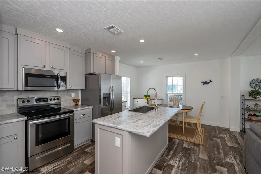 New - 2023 - only lived in for 3 months - Direct Gulf Access, 2 bedroom plus den manufactured home in St James City. Welcome to your dream waterfront retreat! This beautifully crafted home features an open floor plan, perfect for entertaining and every day living. The spacious great room flows seamlessly into the oversized screened lanai, where you can unwind and take in the breathtaking water views. At the heart of the home is a dream kitchen, complete with a large island, abundant wood raised cabinets and stainless steel appliances, making it a chefs paradise. The master suite features a generous walk in closet and luxurious bathroom with walk in shower and dual sink vanity. Two additional guest bedrooms, or a den, provide amble space for family and friends. In residence laundry room. For the fishing and boating enthusiasts the famous fishing grounds of Pine Island Sound are minutes aw...