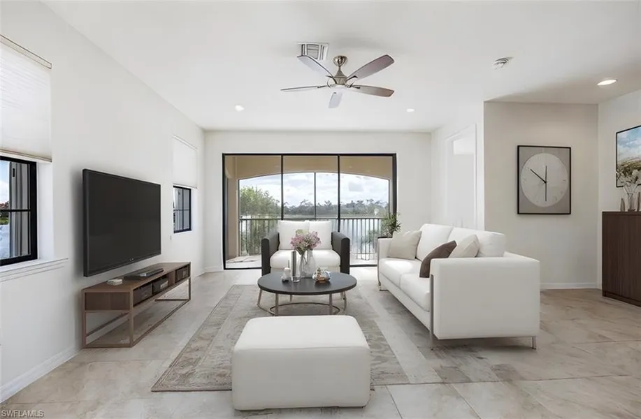 Welcome to this spacious 3-Full Bedroom End-unit Condo with sparkling Southern Lake Views and a charming fountain. The numerous Large Windows fill the condo with light in every room. Freshly Painted, this distinctive home features an Expanded Floor Plan, adding Extra Square Footage to the master closet and bath. Enjoy the bright, Open-Concept Layout with a Modern Center Island, Stainless Steel Appliances, newer Bosch Dishwasher, walk-in Pantry, All-Tile Flooring, Volume Ceilings, 8' Doors and a Culligan Water Softener. The 2nd floor unit also includes an Attached 1-car Garage and accordion Storm Panels for peace of mind. Located in the sought-after Paloma residential community, you'll enjoy a Vibrant Lifestyle with Resort-Style Amenities, including a sparkling Resort Style Pool, Large Clubroom, Fitness Center, and Two Tennis Courts and Bocce Court Numerous Activities and Clubs include Bike Club, Billiards, Book Club, Bridge, Cafe of Life, Game Night, Ladies Luncheon, Mahjong, Poker Night, Coffee Meet-Ups, and Water Aerobics. Only minutes from the beautiful beaches of Bonita Beach and Fort Myers Beach, as well as premier shopping at Coconut Point Mall and Miromar Outlets. With convenient access to I-75 and the Airport, Paloma provides an ideal location for easy travel and endless recreation. This is more than a home-it's a Lifestyle!