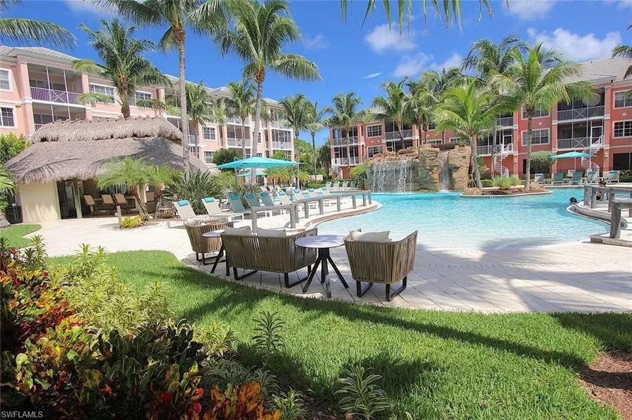 Feel at home in this beautiful 2 bedroom, 2 bathroom condo. Enjoy the soothing sights and sounds of our waterfall and Resort Pool from your private lanai. This third-floor condo has one of the best views in Bonita Village complimented by contemporary furnishings and a fully equipped kitchen. Bonita Village is a luxury gated condominium community located in beautiful Bonita Springs, Florida just minutes from some of the best beaches in the world. With both our large Resort Pool and tranquil Quiet Pool, relaxation is all but guaranteed! Fancy a workout? Our Island House Clubhouse offers a state-of-the-art fitness center, fully stocked with Cybex equipment. If you are feeling parched, our poolside chickee, the Groggy Frog, serves mouthwatering wine-based cocktails and beer (in-season, weather permitting) or you can put on your chefs hat and head to our grilling area! For your convenience, e...