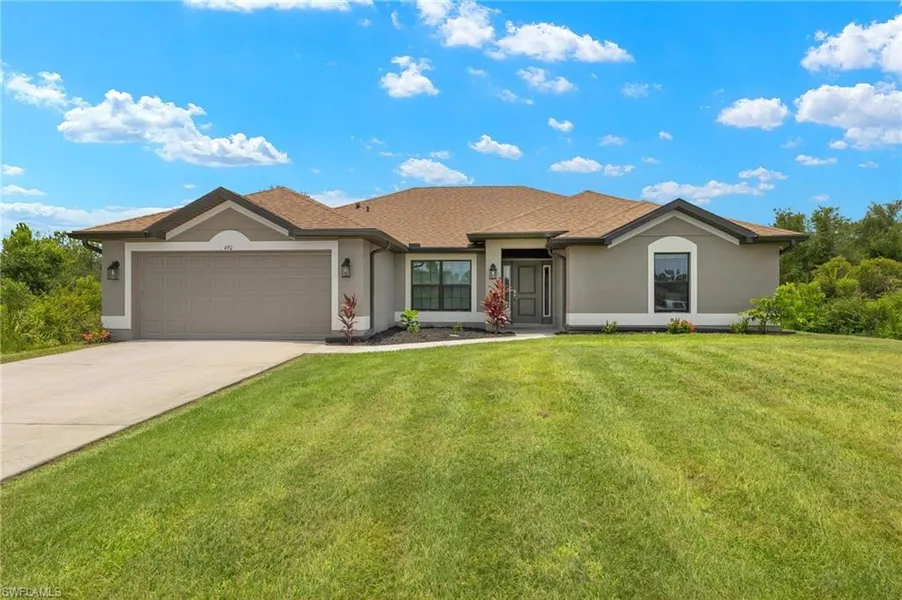 Discover your dream home! This stunning 4-bedroom, 3-bathroom gem, built in 2022, is ready for you to move in. With laminate wood flooring throughout, this home exudes modern sophistication. Step inside to find a versatile formal dining room, perfect for an office or hobby space. The heart of the home, the great room, flows seamlessly into a spacious, oversized kitchen, complete with sleek granite countertops and an abundance of cabinets-ideal for entertaining. You'll love the top-of-the-line stainless steel appliances that make cooking a pleasure. Retreat to the luxurious master bedroom, roomy enough for a king-size bed and features a generous walk-in closet. The en-suite master bathroom boasts dual sinks and a large walk-in shower, offering a spa-like experience at home. The guest wing provides three additional bedrooms and two bathrooms, ensuring plenty of space and privacy for everyone. Convenience is key with an indoor laundry room that includes extra storage. Step outside to a large lanai with a picture screen, creating an inviting outdoor living space. There's ample room for a pool, perfect for making memories with family and friends. Located in the desirable Greenbriar area, this home is the epitome of move-in ready. Why wait for new construction when you can have it all right now?