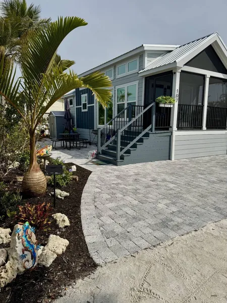 Discover coastal charm and modern convenience in this nearly new tiny home, perfectly situated on beautiful Sanibel Island Florida. Built in May 2024, this meticulously designed home offers one bedroom, one bathroom, a loft and luxurious upgrades including stainless steel appliances, elegant quarts countertops and stylish furnishings - all included. Step outside to a stunning tropical landscaped yard featuring new permeable pavers and a convenient 4 x 6 storage shed. This island gem won't last long!