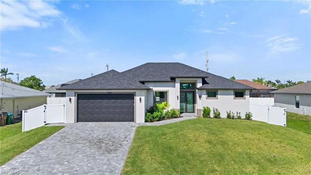 This elegant new construction home, built with hurricane impact windows and doors, offers 3 bedrooms + a den, 2 bathrooms, and 1,869 sqft of thoughtfully designed living space in the heart of SW Cape Coral. From the moment you enter through modern French doors, you're welcomed by a bright and airy interior featuring polished marble tile floors and soaring ceilings enhanced by recessed lighting. The contemporary kitchen boasts quartz countertops, light wood cabinetry paired with sleek white uppers, and pendant lighting above a spacious island. The primary suite features two walk-in closets with custom built-in shelving, and a spa-style bathroom with a frameless glass walk-in shower and double vanity with quartz counters. Both secondary bedrooms are spacious and filled with natural light, complete with ceiling fans and generous closet space. A modern full bathroom with a glass-enclosed shower is conveniently located to serve family or guests and also functions as a pool bath. Additional highlights include a large laundry room and expansive sliding glass doors that seamlessly blend indoor and outdoor living. Step out to a covered lanai featuring a built-in outdoor kitchen, a sparkling private pool and spa, outdoor shower, and a fully fenced backyard-perfect for relaxing, entertaining, and enjoying the Florida lifestyle year-round. Just minutes from waterfront dining, Rotary Park, Gulf coast beaches. Some photos include virtual staging. *DESIGN SERVICES INCLUDED, MAKING IT EASY FOR THE BUYER TO FURNISH THE PROPERTY AS SHOW*
