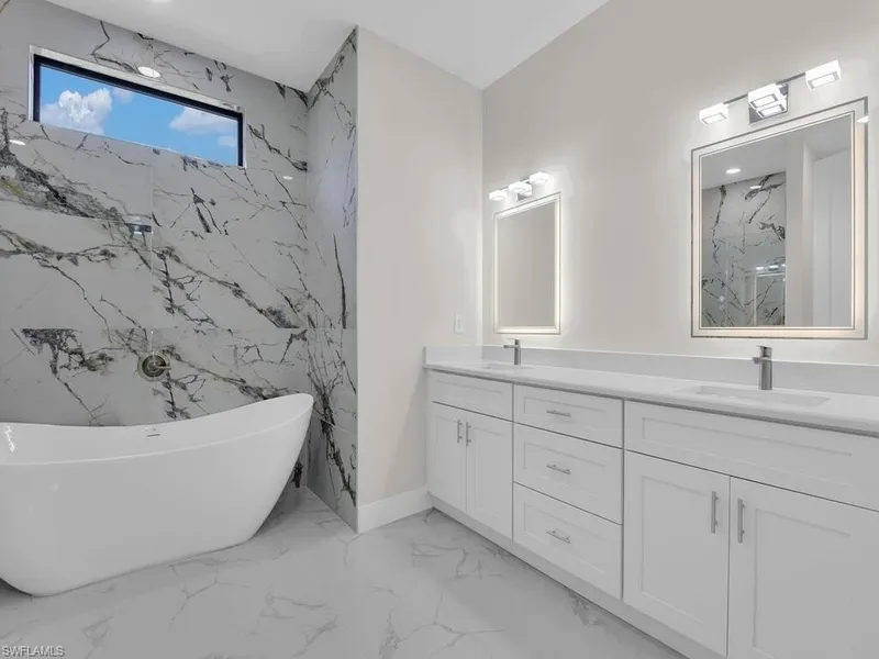 Brand-New Construction - Be the First to Call It Home! Step into modern luxury with this stunning, newly constructed 4-bedroom, 2-bath home nestled on an oversized lot in one of Lehigh Acres' most desirable areas! Crafted with quality and style in mind, this home offers a bright and open floor plan featuring premium finishes throughout. The expansive kitchen is a showstopper-equipped with stainless steel appliances, crisp white cabinetry with brushed nickel accents, recessed LED lighting, and eye-catching spiral pendant fixtures. Quartz Calacatta Plata countertops extend from the kitchen to bathroom vanities, backsplash, and even window sills, adding a seamless touch of elegance. The luxurious master suite is your private retreat, complete with a walk-in shower, separate soaking tub, and generous space for relaxation. A versatile fourth bedroom offers the perfect option for an office or flex space. Built with durability and safety at the forefront, the home includes impact-resistant doors and windows, a sprinkler system, and a dedicated laundry room with utility sink. Enjoy the convenience of nearby shopping, major roadways, and everyday essentials-this is Lehigh living at its finest! Don't miss your chance to own this move-in ready masterpiece.