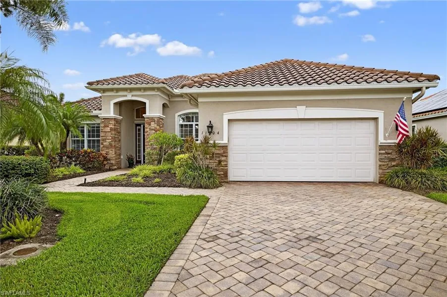 Live the Florida lifestyle in this stylish and spacious 3-bedroom + den, 3.5-bath pool home in the resort-style community of Bridgetown! From the moment you step inside, soaring 12-foot ceilings, elegant crown molding, and plantation shutters create a sense of warmth and refinement. Tile and laminate flooring flow throughout the home, offering both beauty and easy care. The generously sized primary suite is a true retreat, complete with a cozy sitting area, dual walk-in closets, and a spa-inspired bath featuring two vanities, a soaking tub, and a separate shower. A private ensuite bath in the second bedroom is perfect for guests, while the pool bath offers added convenience for outdoor living. Step outside to your own backyard oasis-relax in the heated pool and spa while taking in peaceful lake views. Whether you're hosting friends or enjoying a quiet evening under the stars, this space delivers. The 4-foot garage extension provides ample room for extra storage, hobbies, or larger vehicles. Bridgetown residents enjoy access to two sparkling community pools, tennis courts, pickleball, bocce, a BBQ/firepit area and a play area -resort-style amenities just steps from your door. With thoughtful upgrades throughout and a prime location near RSW, dining and shopping, this home offers the perfect blend of comfort, style, and fun-come see it for yourself!