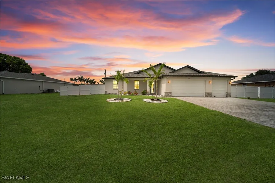 Discover the "Gran Caiman" Floor Plan on an Oversized Lot! This stunning new construction home in beautiful Southwest Florida offers 3 bedrooms plus a den and a spacious 3-car garage that has been professionally converted into a 2-bedroom guest apartment with a full kitchen and bathroom-perfect for guests, extended family, or additional income. Enjoy the ultimate Florida lifestyle with a fully fenced backyard, an outdoor kitchen, two pergolas, and a sparkling pool. The open-concept design features 9'4" ceilings with 10' tray accents, 8-foot doors throughout, a large, covered lanai ideal for outdoor living, and elegant tile flooring throughout. The modern kitchen boasts granite countertops, a center island, soft-close cabinetry, and a stainless-steel appliance. Both bathrooms are equally refined with granite finishes. Built with solid concrete block construction, this home also includes impact-resistant windows, a high-efficiency A/C system, a sprinkler system, and attractive stone accents on the front elevation. All furniture is negotiable. This home combines quality, style, and comfort in one ,schedule your private tour today!