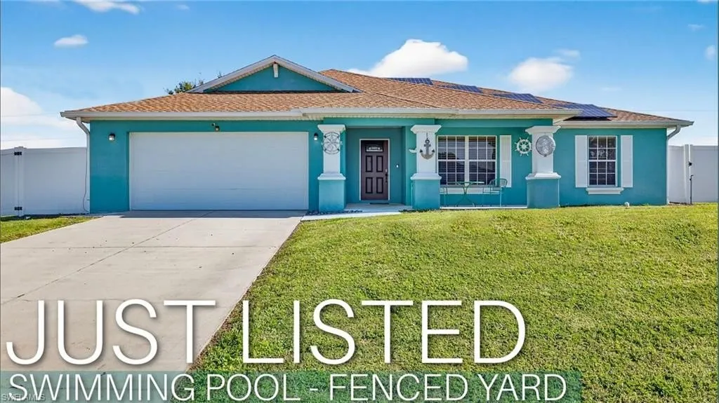 WELCOME TO THE BLUE LAGOON!! With its sparkling pool, solar power, Tesla battery system, impact windows and doors, large fenced in yard, tropical accents and cool coastal vibe, you will be happy to call the BLUE LAGOON your new home!! ASSUMABLE INTEREST RATE OF 2.78% on $295K! Features of this beautiful property include, welcoming great room floorplan, tile throughout (no carpet), soaring tall ceilings, renovated kitchen including 4-person raised breakfast bar with tiled bar wall, stainless steel appliances, Corian countertops, over and under counter lighting and gorgeous mosaic blue glass backsplash! Next you will find a large master suite with spa like en-suite bath highlighted by a gorgeous walk-in, dual head shower with frameless glass enclosure; large soaking tub and dual vanity. Continuing through you will be happy to find 2 large guest bedrooms, updated guest bathroom with newer walk-in shower, upgraded fans and light fixtures throughout, Rain Soft whole home water treatment system, Rain Soft Ultrafine II Reverse Osmosis drinking water system, smart thermostat and doorbell, video cameras and more!! Outdoors you will be blown away straight to Margaritaville with a huge, heated pool with interactive customizable lighting, large covered lanai, ELECTRIC ROLLDOWN HURRICANE SCREENS ON REAR LANAI, upgraded pool cage with 100 color customizable lanai lights, sun/grilling patio with gazebo, large and fully irrigated backyard with vinyl privacy fence, bonus gate to allow for boat or RV storage and so much more! Age of Key Components are as Follows: Roof (2023), AC (2016 with newer coil and compressor), Eco- Efficient Water Heater (2021), Kitchen Range (2024). Other features include Generator with Two 100-gallon propane tanks, video cameras, Pit Boss Smoker Grill, patio set and awning and more!! This home can fully function in a power outage situation!! Home is located near shopping, dining, entertainment and all that Sunny SW Florida has to offer!! Call for your private showing today!
