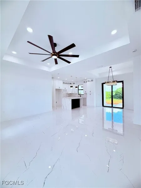 Exceptional New Construction Pool Home in Cape Coral Experience refined Florida living in this impeccably built new construction pool home, where modern architecture meets thoughtful design. Offering 3 bedrooms and 2 bathrooms, this residence features a bright, open-concept layout enhanced by high ceilings, tray ceiling accents, and elegant porcelain tile flooring throughout. The gourmet kitchen serves as the centerpiece of the home, showcasing sleek modern cabinetry, quartz countertops, an oversized island, and designer lighting-perfectly suited for entertaining and everyday living alike. Natural light fills the space, creating a seamless connection between indoor comfort and outdoor enjoyment. The primary suite is a private retreat, featuring a spa-inspired bathroom with dual vanities, a glass-enclosed walk-in shower, and contemporary finishes that reflect quality craftsmanship throughout the home. Step outside to a fenced backyard designed for relaxation and entertaining, complete with a newly built pool and covered lanai-ideal for enjoying Florida's year-round sunshine. Additional highlights include impact-resistant windows and doors, city water with assessments paid in full, and a location in Flood Zone X for added peace of mind and potential insurance savings. Some photos may be virtually enhanced or AI-generated for visualization purposes. This exceptional property delivers comfort, style, and value-schedule your private showing today.