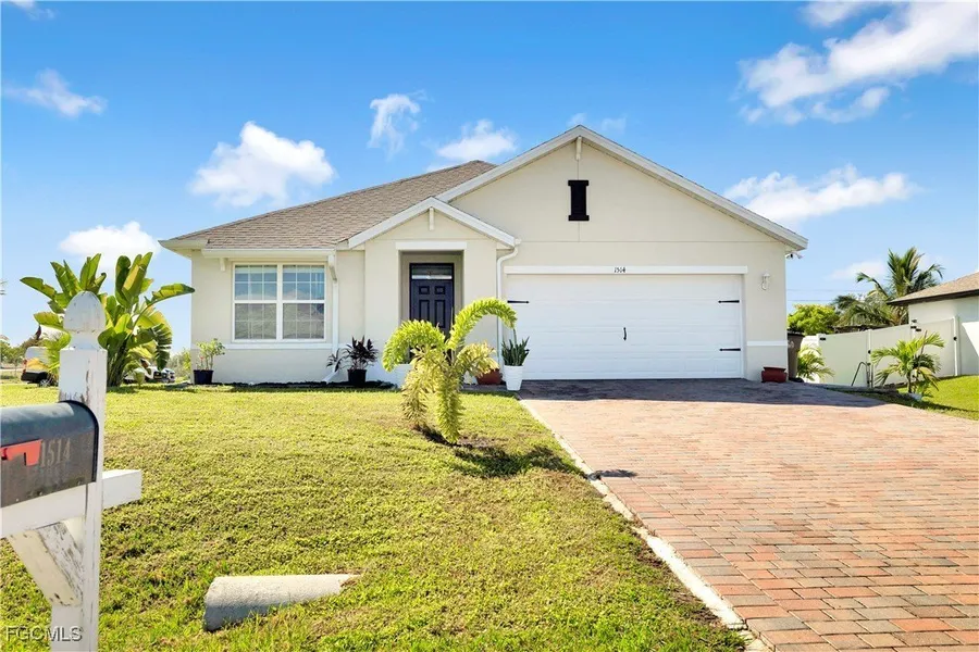 LOCATION! LOCATION! LOCATION! WELCOME TO THIS AMAZING HOME BUILT IN 2023! This home is built with an ARIA floor plan with 1672 sq ft. Prime corner lot, located in Cape Coral right near Del Prado Blvd and Pine Island Rd. Home comes with 36" designer white kitchen cabinets with hardware, quartz kitchen countertops, solid surface bathroom countertops and luxury ceramic tile flooring throughout, stainless steel kitchen appliances, white washer and dryer, blinds on all windows, paver driveways and covered lanai, full irrigation system, internet controlled electric garage door and much more, Come today and make this gem your new home.