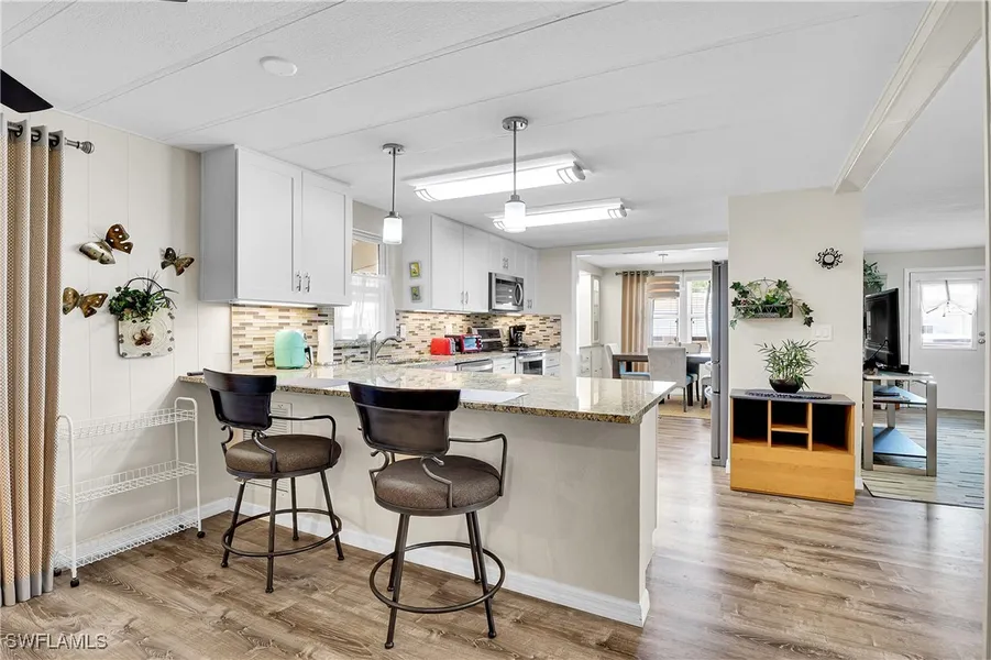 16007 Tangelo Way is a Lovely Turnkey property that boasts numerous upgrades and improvements. The home features new 3/4 inch plywood sub floors and new Luxury Vinyl flooring throughout as well as new ceiling fans. The kitchen has been completely remodeled with white Shaker cabinets, granite counter tops, new plumbing, new electrical wiring and appliances. Look at the Tile Back splash! The bathrooms have new vanities, sinks, and toilets. The new windows have new treatments and blinds, and the home comes fully furnished with some furniture from Baer's Furniture. The exterior of the home has also been updated with all new vinyl siding, new metal roof, new insulated carport with recessed lighting and new windows. A washer and dryer are located in the shed, and the driveway has a decorative coating. The screen room is nice for enjoying the fresh air and features waterproof curtains and the property includes irrigation for shrubbery. This home has been extensively upgraded from 2018 to 2023, making it a modern and comfortable living space for its new owners. Included in the sale is a Park Certificate Valued at $11,500 which lowers the maintenance fee to $214 monthly. Tangelo Way is a low traffic side street and is in a central location close to all the community has to offer and a short distance to Flamingo Hall and pool. You will enjoy the East facing front porch with your morning coffee and the warmth of the morning sun, what a great place to socialize with neighbors and friends. Tamiami Village is a 55 and Older Pet Friendly Very Active Community and has Many Amenities Including 3 Heated Swimming Pools, Spa, Shuffleboard courts, Horseshoes, Billiard Rooms, 2 Clubhouses, Fitness Center and Library. The Community is Close to Dining, Shopping, Golf and Beaches!