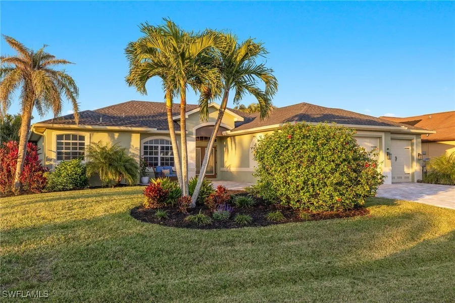 Welcome to this stunning 3-bedroom, 2-bathroom home offering a perfect blend of comfort and elegance. As you enter, you're greeted by an inviting open floor plan featuring a spacious great room and a formal dining area that overlooks the beautifully appointed kitchen. The kitchen boasts ample cabinets, a pantry, granite countertops, and an eat-in area with views of the pool. The master bathroom is a sanctuary with a stylish cast iron claw foot tub, a custom porcelain tile shower surround adorned with mosaic glass accents, and his & hers vanities topped with Carrera marble. Throughout the home, porcelain tile flooring enhances the aesthetic appeal, complemented by voluminous ceilings, crown molding, and base trim. Step outside to discover the screened-in lanai showcasing a 15x32ft saltwater swimming pool, perfect for relaxing and entertaining guests year-round. Additional highlights include new ceiling fans, a new roof (2022), newly landscaped front yard with a brick paved walkway and patio area, new pool pump and heater, 3-car garage with epoxy flooring providing plenty of space for vehicles, storage, or a workshop. This home combines modern luxury with functional design elements, creating an ideal living space in a desirable Cape Coral location!! Assessments paid. Close to schools, walking distance or a short drive to dining, Camelot Park & Cape Harbour.