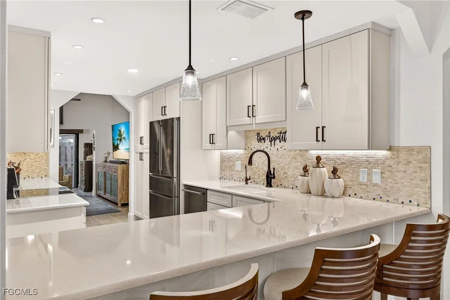 *****PRICE IMPROVEMENT******MOVE-IN, RECENT UPDATES THROUGHTOUT!!!! WOW!... This beautifully remodeled villa offers a bright, open layout designed for effortless Florida living. Enjoy TWO spacious living areas, an enclosed lanai, vaulted ceilings, and a stunning UPSCALE kitchen featuring custom cabinetry with pull-out shelving, quartz countertops, a premium stainless steel appliance package including an induction range with double ovens, and rare OVERSIZED TWO CAR GARAGE. Every inch of the home has been thoughtfully upgraded. You'll find quartz countertops not only in the kitchen, but also in every bathroom and even the laundry room, along with a new washer and dryer. Tile flows throughout the entire home, creating a clean and cohesive look. Lighting has been updated from the kitchen to the exterior landscape, giving the home a warm, polished feel day and night. Both bedrooms function as private suites, and all bathrooms have been stylishly renovated, including a luxurious steam shower in the main ensuite. Additional upgrades include a NEWER engineered tile roof, newer A/C, impact windows and sliders, storm protection, porcelain tile flooring, and tasteful custom window treatments. Living in The Landings Yacht, Golf & Tennis Club means truly resort-style amenities: unlimited golf, tennis, pickleball, bocce ball, a full-service marina with boat slips up to 60', fitness center, community pool plus a Jr. Olympic lap pool, two on-site restaurants, clubs, and nonstop activities. The location is unbeatable, close to the River District, theaters, beaches, great dining, shopping, and RSW International Airport. Sports fans will love nearby Everblades hockey and Spring Training baseball. A fully updated, move-in-ready home offering exceptional quality and one of the best lifestyle communities in Fort Myers.