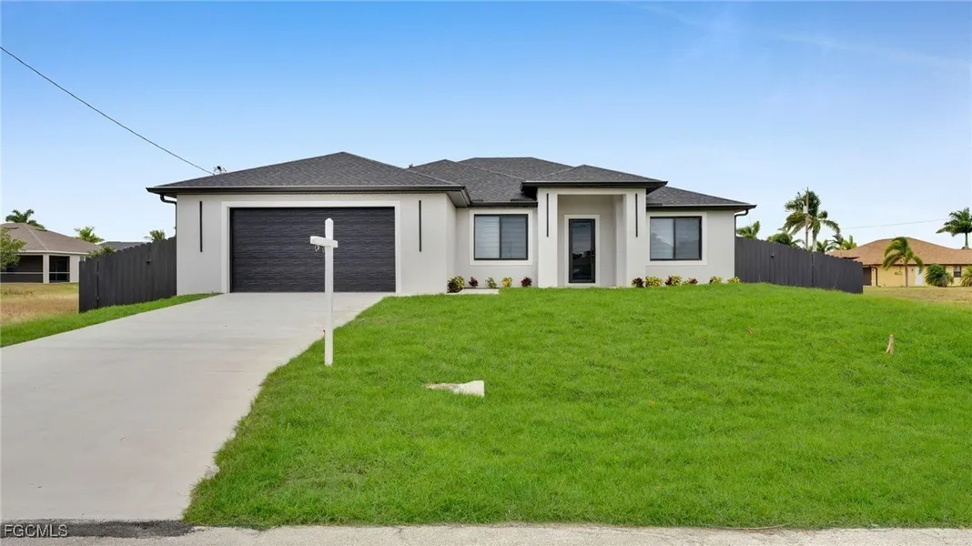 Stunning new construction home on a desirable corner lot, surrounded by beautiful Gulf-access homes. This modern property offers tile flooring throughout, a spacious den, and an open-concept layout with sleek contemporary finishes. The gourmet kitchen features a striking waterfall island, while the outdoor living area is perfect for entertaining with outdoor kitchen and a convenient pool bathroom. Bright, airy interior with high ceilings and elegant lighting. Prime location close to shopping, schools, and Cape Coral's best waterfront communities-move-in ready and built to impress!
