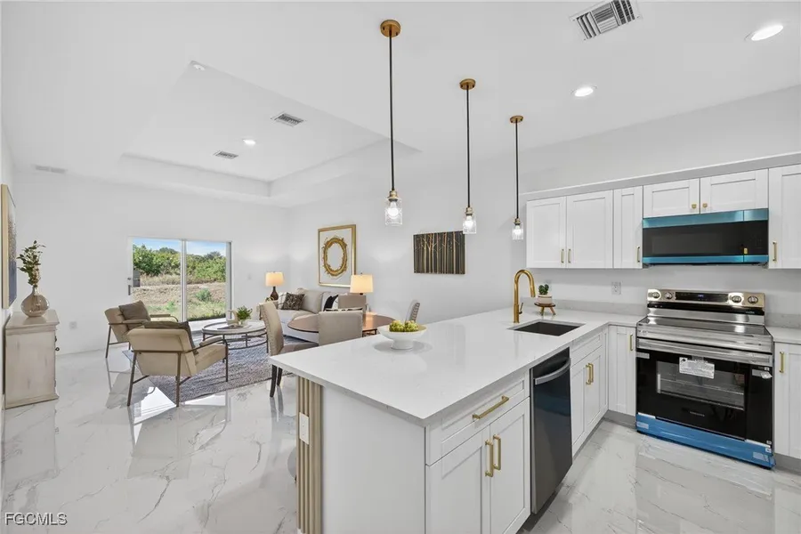 SELLER OFFERING $10,000 TOWARD BUYER CLOSING COSTS! Move-in ready and beautifully staged! This newer 3-bedroom, 2-bath home features an open layout with 9'4" ceilings and 10'4" tray ceilings in the living room and primary suite, creating a bright and spacious feel. The modern kitchen includes stainless steel appliances, shaker cabinets, and a large breakfast bar. Porcelain tile flooring, hurricane-impact windows, a paver driveway, and a covered lanai add style and peace of mind. Located in a quiet, welcoming Lehigh Acres neighborhood close to schools, parks, and shopping. Take advantage of the $10,000 seller credit to lower your cash to close or buy down your interest rate - schedule your showing today!