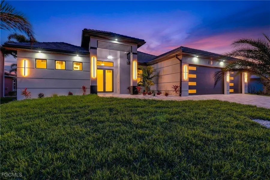 Southern Exposure Luxurious New Pool Home Nestled in the highly sought-after and tranquil residential neighborhood South of Cape Coral Parkway Built across from Gulf access homes in Unit 69 . Cape Coral's exclusive SW corridor of Luxurious Estate homes. This luxurious single-story masterpiece with Southern Exposure offers the perfect blend of elegance, comfort, and modern sophistication. From the moment you arrive, you'll be captivated by the home's clean architectural lines, expansive driveway, and impeccable curb appeal. Step inside to soaring ceilings, premium finishes, and a light-filled open-concept design that seamlessly blends indoor and outdoor living. This magnificent residence features a thoughtfully designed 3-bedroom + Den/office, 3-bathroom layout that caters to both relaxed living and stylish entertaining. The chef-inspired kitchen boasts custom cabinetry, walk in Pantry ,quartz waterfall edge custom center island and quartz countertops with stainless steel appliances includes separate cooktop and built in oven and Microwave combo all flowing effortlessly into the main living space. Designer large Porcelain tile flooring runs throughout the home adding to the upscale luxurious feel. Enjoy appointments in the living and dining area. The primary suite offers a serene retreat with dual vanities, a walk-in shower and separate soaking tub within, spacious custom built walk-in closets. Two additional bedrooms provide plenty of space for family or guests. For added safety and energy efficiency, the home is equipped with Low E impact-resistant full storm protection windows and doors, offering year-round peace of mind. Step outside to the covered lanai featuring a fully equipped outdoor kitchen, complete with a built-in gas grill, drink cooler fridge and sink-ideal for effortless outdoor cooking and entertaining. Adjacent to the pool area, a convenient pool bathroom offers easy access and added comfort for swimmers and guests. The beautifully landscaped backyard also showcases a custom-designed saltwater pool heated pool and European style spa that disappears within pool creating a private oasis fully screened for relaxation and outdoor enjoyment. Located just minutes from Cape Harbour, waterfront dining, boutique shopping and some of Southwest Florida's finest beaches. This Newly constructed luxurious home delivers an exceptional living experience in one of Cape Coral's most prestigious neighborhoods.