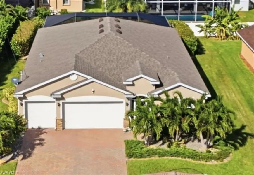 Luxury Pool Living in the Prestigious Pelican Neighborhood of SW Cape Coral - ALL ASSESSMENTS PAID & IMPACT WINDOWS. Welcome to this exceptional newer-construction home offering 2,372 sq ft of refined living space, featuring 3 bedrooms + den, 3 full baths, and a 3-car garage. Perfectly situated across from upscale canal homes, this residence blends luxury, comfort, and modern design in one of Cape Coral's most sought-after neighborhoods. Step inside to an expansive open floor plan enhanced by diagonal tile flooring throughout, elegant tray ceilings, and thoughtfully curated upgrades. The chef-inspired kitchen boasts a large granite island, stainless steel upgraded appliances, stylish backsplash, walk-in pantry, and 42" upper cabinets with under-cabinet task lighting-ideal for both entertaining and everyday living. A formal dining room, casual breakfast nook, and spacious great room provide flexible gathering spaces. The adjacent den with French doors offers the perfect spot for a home office, game room, or additional guest space. Retreat to the luxurious primary suite, complete with a spa-like bathroom showcasing a soaking tub, separate walk-in shower, and dual sinks. The split-bedroom layout provides added privacy, with the guest bedrooms located toward the front of the home and served by a custom full bath featuring a walk-in shower with dual shower heads. Step outside and the home transforms into a private tropical sanctuary. Impact sliding doors open to a lush, resort-style retreat that embodies the very best of Southwest Florida living. The expansive lanai showcases a heated saltwater pool with sun shelf and a tranquil waterfall feature, surrounded by swaying palms, privacy landscaping and breezy open-air lounging spaces designed for pure indulgence. From sun-drenched afternoons drifting in the water to tranquil evenings unwinding in the warm coastal air, this outdoor haven delivers a year-round escape that feels like your own slice of paradise. The home is equipped with impact windows and an electric storm shutter on the lanai for added peace of mind. Additional upgrades include custom drapery, automatic blinds, upgraded lighting and ceiling fans, and a paver driveway leading to the spacious 3-car garage. This impeccably maintained home embodies the Florida lifestyle-luxury, convenience, and relaxation.