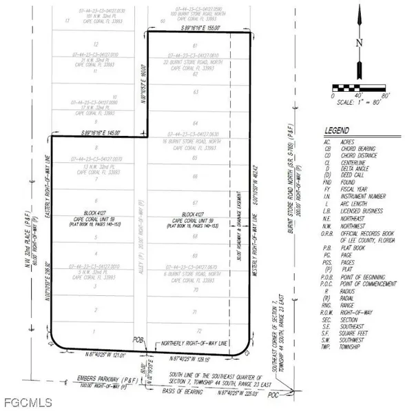 **CITY-OWNED PROPERTY** This property is required to be listed for a minimum of thirty (30) days prior to bringing a contract before City Council for approval. Positioned at the highly visible northwest corner of Burnt Store Road and Embers Parkway, this exceptional vacant commercial site offers a rare development opportunity within one of Cape Coral's rapidly growing corridors. With additional frontage along NW 32nd Place, the property provides multiple points of access, prominent corner exposure, strong traffic visibility, and substantial frontage along three roadways. Located approximately one mile east of the future 7 Islands development and serving as a southern gateway to the area, the site is well suited for a variety of commercial uses, subject to restrictions, zoning and approvals. The offering consists of approximately 2.8+/- acres of vacant commercial land, including a platted alley within the site that has been successfully vacated by the City, allowing for a more efficient and cohesive development footprint, as reflected in the boundary survey. This strategically located property represents an outstanding opportunity for developers or investors seeking a high-profile commercial site in a rapidly expanding market. This property is subject to the City of Cape Coral's North 3 Utilities Extension Project (UEP). All interested parties should independently verify assessments, costs, and implementation timelines with the City prior to submitting an offer. See supplemental attachments in MLS for Restrictions.