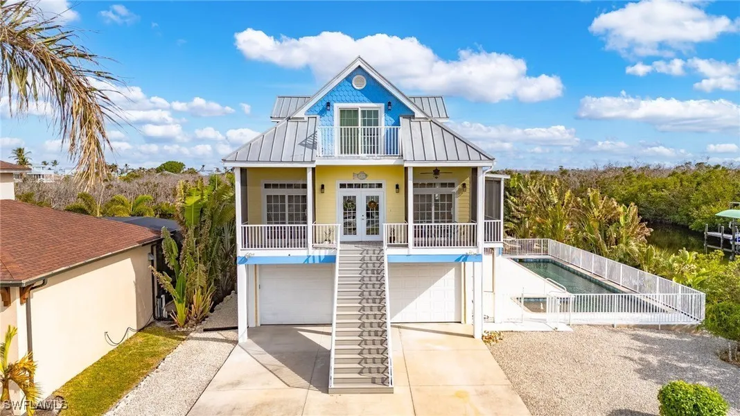 As you enter this unique custom home you will be surrounded by tropical colors accented with the warm tones of bamboo, cypress, and mahogany. The architecture and decor were inspired by the current owners' travels to the Keys, Caribbean, and South Pacific. The floor plan was designed with the retired couple in mind, anticipating many visits from adult children and grandchildren. The master suite is located on the main floor, while the third floor has three bedrooms and its own bathroom, thus giving privacy to all when wanted. This is a very comfortable home for day-to-day living. With its many windows and screened porches, this home is bright and airy, often times does not need AC due to the flow-through breezes. There is even a small screened porch directly off the kitchen that was designed just for the grill, and also a breakfast porch. The floor treatments are a combination of tile, carpet, and wood for easy maintenance and sound control. Just inside the front door is a room that was designed as an office with double entry doors, perfect for a business in the home. There is a conveniently located elevator that goes to all three floors. On the main floor the elevator stop is in the kitchen, making bringing up groceries from the garage to the kitchen a breeze. The ground level offers a large garage and an air conditioned bonus room with an attached bath and outdoor shower. The garage ceiling height is 10 foot, with 9 foot garage doors, including plenty of room for vehicles and storage. Outside you will find nearly one-half acre of land with approximately 360 feet of waterfront, with mere minutes to San Carlos Bay, the Intracoastal Waterway, the Gulf of Mexico, and all the outer islands of Lee County, including some of the best fishing in all of SW Florida! The environmentally friendly landscape includes many palms, bamboo, bougainvillea, hibiscus, orange tree, oleander, and even a gumbo limbo tree. The shoreline is lined with sea grapes and mangroves, true Florida native plants. As you step down onto the approximately 100 feet of dock you will find a 20,000 pound and a 7,000 pound boat lift along with a covered fish cleaning station. From the main floor of the home, you will enjoy descending the spiral staircase onto the pool deck of the 50 foot by 10 foot lap pool. The pool also has an adjacent shallow area especially for the toddler grandchildren. On those hot Florida days, you will enjoy the shade of the pool deck's tiki and using the wonderful outside tiki shower. As an added feature all outside deck railings are constructed of low maintenance aluminum, and decks and docks are composite planked. While not included in the price, some furnishing and the 21 foot Key West boat are negotiable.