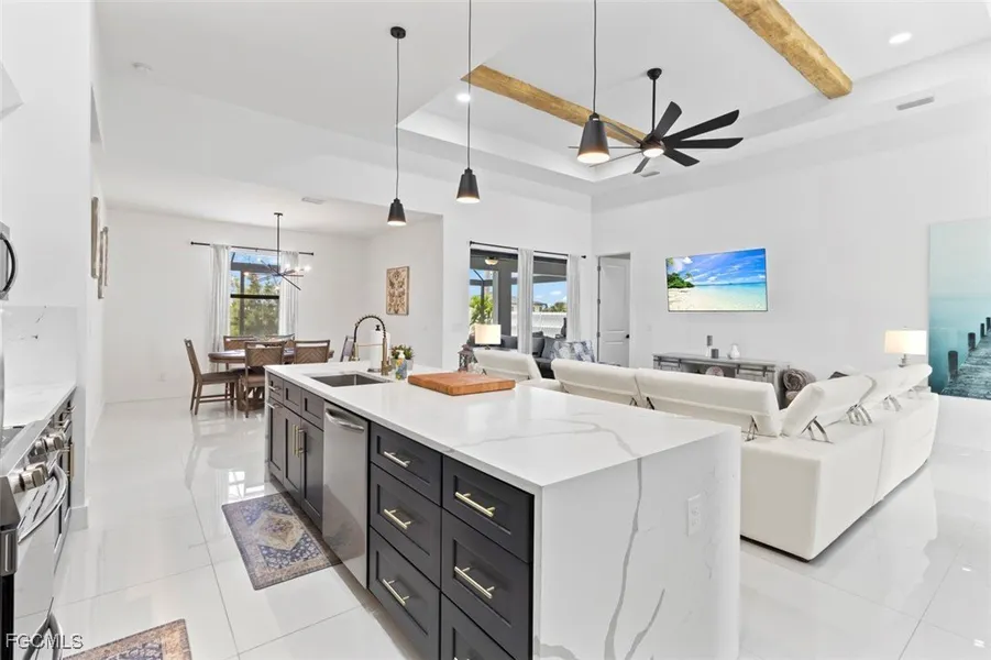 Priced to sell fast at $559,955 for this amazing almost new home that would make a great investment, vacation rental or an incredible primary residence. You've got to see this one before it's too late. Stunning and Contemporary canal front home that's centrally located. The salt water pool is heated with pool cage and picture frame screens to enhance the views of the Hermosa canal. There is so much to love about this home. The huge covered lanai, outdoor kitchen, fully fenced yard with large level area and totally upgraded interior is just the beginning. The great room is a totally open plan with recessed ceilings, wood beams and great views. It's on city water and sewer with all assessments paid at closing. It's not in a flood zone, so no Flood Insurance required here. There are three large bedrooms plus a great den/office, 3 full baths including a direct access pool bath. There is an amazing primary suite with recessed ceilings, two walk-in closets, a luxurious bath with soaking tub and separate shower, plus a second guest suite with direct access bath. The kitchen is a chef's dream with two tone custom cabinets, quartz counters with oversized waterfall island, upgraded Frigidaire Stainless Steel Gallery appliance package, built-in microwave and separate vent hood, a wonderful pantry and frosted glass accent cabinet doors. The laundry is large with cabinets above the laundry area, a laundry sink and built-in storage area with shelves. The home also has hurricane impact windows/doors, 8ft. interior doors and sliders, and an Impressive 8 ft frosted glass double door entry. One of the best things about this home is the central location, just minutes from the Pine Island shopping corridor. It's back yard and covered lanai face north which is a great to enjoy the wonderful sunrises and sunsets over the Hermosa Canal. This home checks all the boxes, it's a must see.