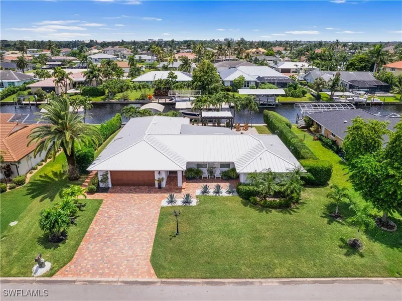 Come home to this stunning Southern exposure 4 bedroom, 3 bathroom single story home located in the highly sought-after Town & River boating community. This home features a brand NEW aluminum metal roof. Boasting an incredible backyard oasis, this property is perfect for those who love to entertain or simply enjoy the Florida lifestyle. The pool area is perfect for relaxing with family and friends, while the custom pergola lounge area provides a shaded retreat. The captains dock with 2 boat lifts, 20k and 10k pounds, both with canopies, makes boating and fishing easily accessible. Inside, the home features custom tumbled marble floors, hurricane impact sliding glass doors and windows, stainless steel appliances, and a gourmet kitchen with custom wood cabinets, and granite counter tops. This home also features a whole home solar powered system by Sunnova Home Solar Service. Don't miss out on the opportunity to make this exceptional property your forever home.