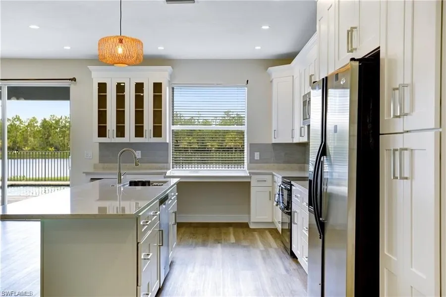 *** THE "WOW" FACTOR***... EXQUISITE OPEN CONCEPT RENOVATION... BRAND NEW ROOF... 5 BEDROOMS+DEN... STUNNING LAKE VIEWS... SPARKLING POOL (2018)... LOW HOA FEES ... From the moment you walk into this stunning remodeled home combined with the panoramic lake/pool views you will be amazed and impressed!!! ~Some of the many fine features of this home are a total reconfigured kitchen with walls taken down to enlarge the kitchen/dining area, beautiful quartz counters, giant island/breakfast bar with under counter lighting and stainless farmhouse style sink, tons of counter space, white soft close cabinetry, wine/coffee bar, wine/beverage fridge, stainless appliances, recessed lighting, built-in desk over-looking pool, large dining area and Great Room plus additional storage under the stairs. ~The entire first floor has luxury vinyl flooring, a guest bedroom and full bathroom with shower/tub co...