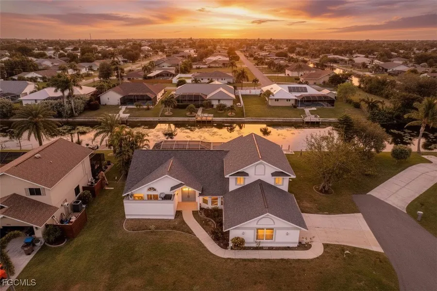 Waterfront Home with Oversized cul-de-sac Lot in Shamrock Lakes! Located at the end of a quiet street in the desirable Shamrock Lakes neighborhood, this spacious waterfront home sits on an oversized, hammerhead-shaped lot, offering 120 feet of waterfront, whereas most nearby lots offer only 80 feet. With 2,956 square feet of living space and nearly 5,000 total square feet, this home offers room for everyone with 5 bedrooms and 3 full bathrooms, perfect for large families, multi-generational living, vacation rental, or flexible options such as a home office or fitness room. The home features a new roof, a fresh coat of exterior and interior paint, and incredible potential for the next owner to customize to their taste. All upstairs windows are hurricane impact. Inside, natural light fills every room, and multiple sets of triple sliding glass doors bring expansive views of the pool and water into the living spaces. The open kitchen offers abundant natural light and overlooks the dining and pool areas, creating the ideal layout for entertaining. A separate living room and family room. The Master Suite is extremely spacious and features cathedral ceilings, wood flooring, and peaceful water views. The master bathroom includes dual sinks, a walk-in shower, a jetted soaking tub, and a private atrium that brings in natural light. Guest bedrooms are generously sized, offering comfort for visiting family and friends. Live the Florida lifestyle in the expansive screened pool area with large, covered spaces for dining and relaxing by the water. A concrete dock and seawall offer additional outdoor living space, perfect for fishing, lounging, or launching a kayak or paddleboard. This freshwater canal system connects to miles of lakes and waterways for boating, fishing, kayaking, paddleboarding, jet skiing, and more. Ideally located near Hunters Run Executive Golf Course, Sun Splash Family Waterpark, and Cape Coral's premier dining and shopping, this home is also close to major redevelopment projects including The Cove at 47th, Bimini Square, the reimagined Cape Coral Yacht Club, and Slipaway Marina, all bringing vibrant new life, waterfront dining, entertainment, and community amenities to the area. Come experience the beauty and serenity of waterfront living on Shamrock Lakes, where every sunset and breeze reminds you why Southwest Florida is paradise.
