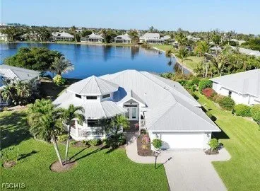 Situated in the gated Caloosa Creek community, this move-in-ready home offers lakefront living with western exposure and sunset views from the spacious screened lanai. Storm-ready features include electric and manual hurricane shutters and a whole-house generator with two 120-gallon propane tanks. Inside, the home features high ceilings, three bedrooms, two bathrooms, and a distinctive two-story turret room, currently used as a den. Two bedrooms enjoy lake views and open to the lanai through French doors. Outdoor living is enhanced by a wraparound front porch and an under-truss lanai overlooking the backyard, with space for a custom pool. The light-filled entry leads directly to water views. The primary suite offers lake views, a walk-in closet, dual vanities, and a large walk-in shower. A brick paver driveway and mature landscaping provide privacy, while the location offers quick access to Sanibel Island, Fort Myers Beach, shopping, and dining. Caloosa Creek features a clubhouse, heated pool, playground, and tennis/pickleball courts. Furniture is negotiable. Private showings available.