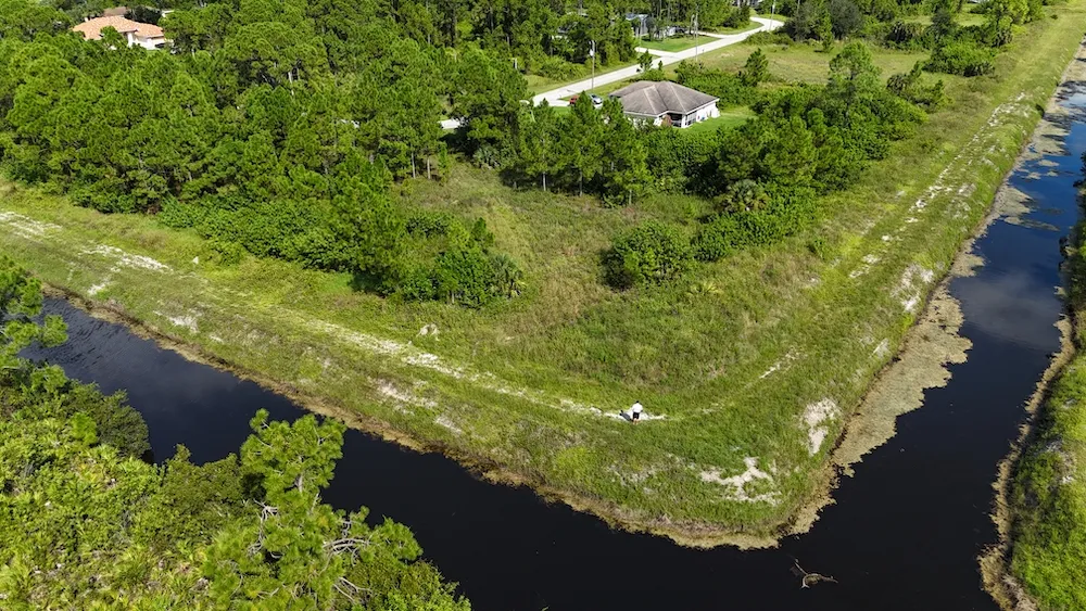 This oversized corner lot offers a fantastic opportunity to build your dream home! Nestled in a quiet neighborhood with minimal traffic, it features a unique shape and spans just under an acre. The property is bordered by a canal on two sides, providing a serene backdrop and enhancing the sense of privacy. With plenty of beautiful mature trees and a cleared area, youll have the perfect canvas for your new home. Enjoy the peace of nature while being conveniently locatedthis lot truly has it all!