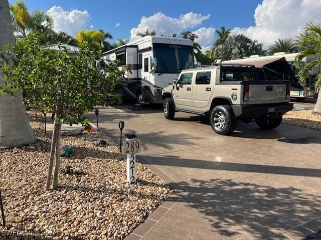 Lot 289 is a straight east facing back in lot and has epoxy concrete on the pad with a soothing, medium brown treatment. It is trimmed out in river rock with a professionally done irrigation system installed for automatic watering of your plants. The landscaping is professionally installed throughout the lot with extra side and rear pavers making the patios much bigger. Sitting on the lot is an 8 x 15' Amazon shed that was built in 2019 and attached exterior 15 foot roof extension (porch) complete with extra electrical outlets for more convenience. The finished Amazon Shed is medium brown plank flooring, painted wood side walls with a finished ceiling, fan and lights. To keep it cool there is an inside window air conditioner and there is extra storage above the bathroom area. Also included in the shed is a shower, toilet and sliding doors for privacy. The main room provides a cabinet with a sink that has a lower and upper mirrored cabinet. There's an in wall washer and dryer, an on-demand hot water heater and a digital flatscreen TV. The double doors that lead to the exterior have adjustable door blinds. This lot is only steps away from our clubhouse.
