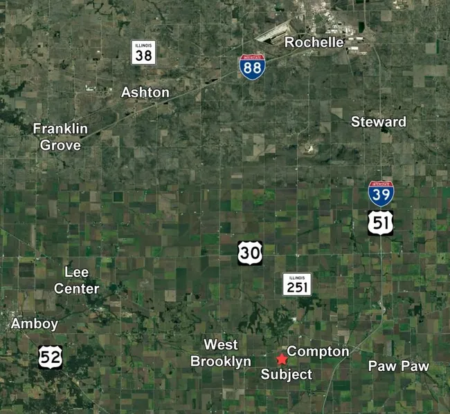 Research Parcel InformationLocation: The subject farm is located approximately 64 miles southwest of Chicago O'Hare International Airport and is partially located within the village of Compton. Nearby cities include: Paw Paw (5 miles east), Amboy (11 1/2 miles west), and Rochelle (13 3/4 miles north).