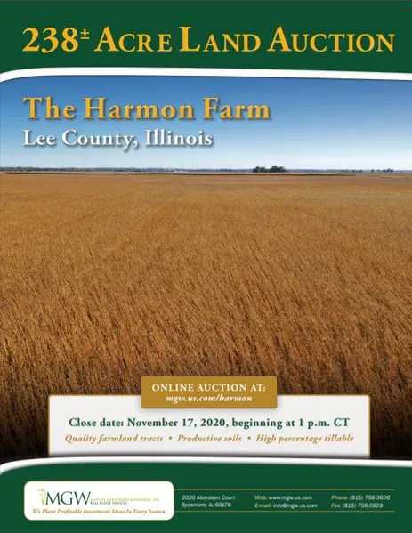 Legal Description: A brief legal description indicates The Harmon Farm is located in Part of the Southwest Quarter and the West Half of the Northeast Quarter of Section 19, Township 20 North Range 9 East (Marion Township), Lee County, Illinois.
