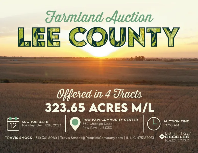 Lee County, Illinois Farmland Auction! Offering 323.65 acres m/l of high-quality farmland located near Paw Paw and available in four tracts. The auction will take place at 10:00 AM on Tuesday, December 12, 2023, at the Paw Paw Community Center. These farms are situated in a strong farming area with excellent investment potential. US Interstate 39 is nearby, creating multiple grain marketing outlets. Nearby transmission lines and substations have the potential to create added value through wind or solar projects. The farm lease has been terminated and the land will be open to farm for the 2024 cropping season.