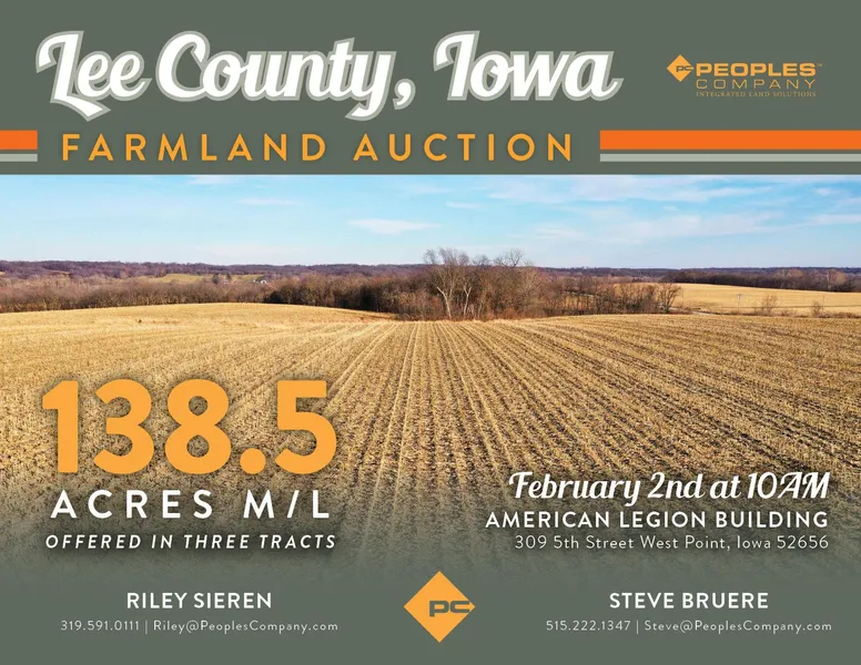 These three Lee County, Iowa farmland tracts will be offered via the "Buyer's Choice" Auction method on a price per acre basis at a public auction on Thursday, February 2nd, 2023 in West Point, Iowa. The high bidder can take, in any order, one, two, or all three tracts for their high bid, and auctioning will continue until all three tracts have been purchased and removed from the auction. Tracts will not be offered in their entirety at the conclusion of the auction. This auction can also be viewed through a Virtual Online Auction option and online bidding will be available.