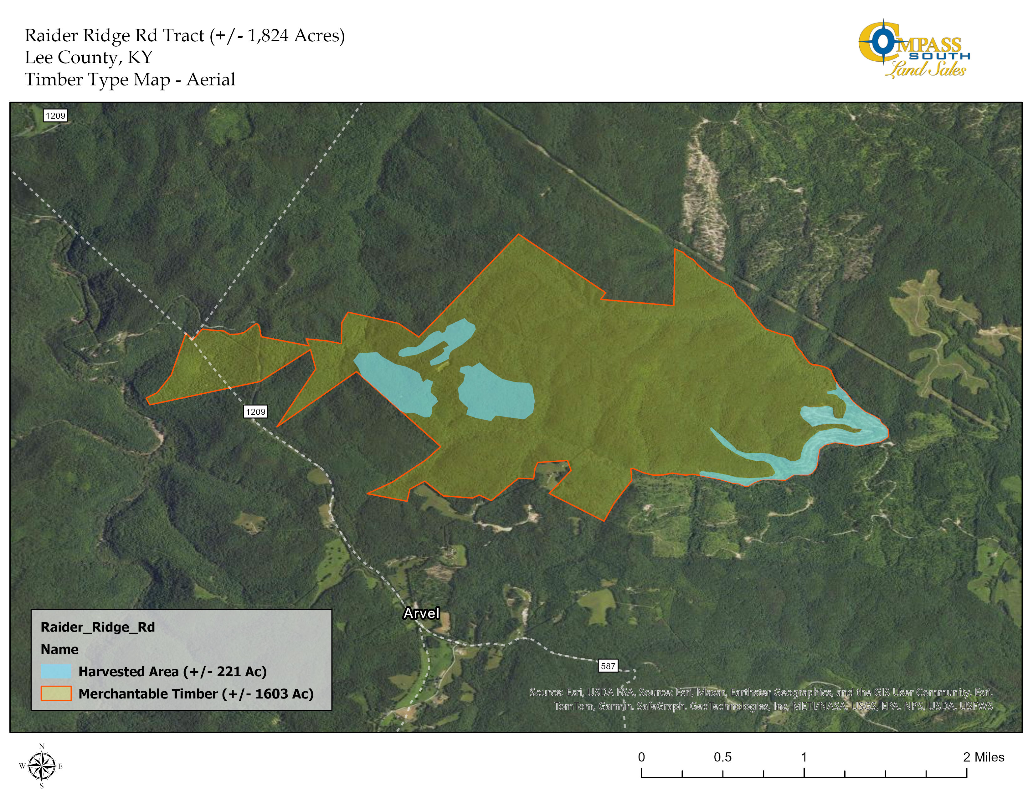 The Raider Ridge Road Tract in Lee County, KY is approximately 27 miles southeast of Richmond and 48 miles southeast of Lexington. The primary access is via Raider Ridge Road which passes through a portion of the Daniel Boone National Forest that shares a boundary with the tract to the southwest, north, and northwest.