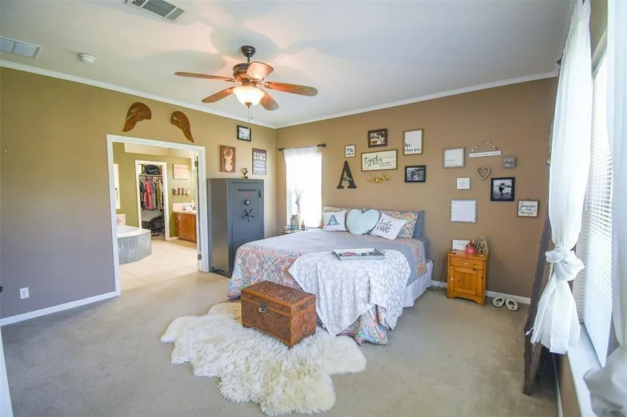 Only minutes from town in an idyllic country setting, this 4 bedroom, 2 bathroom, 2,100 square foot home sits on 5.379 partially wooded acres. The recently painted exterior adds a polished look that continues as you enter the bright, spacious, and open living room, dining area, and kitchen with a multi-level island and plenty of cabinet space. A private office with a built-in desk, shelving, and bench seat leads to the sizable primary bedroom. The expansive ensuite bathroom features a separate tub and shower, dual sinks and vanity, and the walk-in closet of your dreams! The remaining 3 bedrooms are also oversized and feature walk-in closets. A large laundry room leads out onto a covered back porch with swings overlooking the fenced backyard, which is secluded within a grove of mature trees but offers enough open green space for a fire pit, trampoline, basketball hoop, and many other outd...