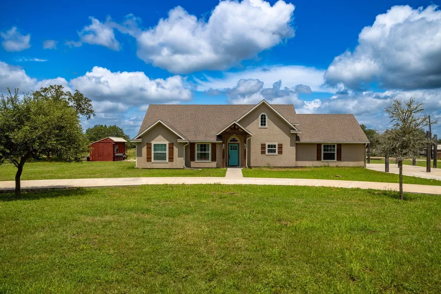 This 4 bedroom, 2 bath home with over 1900 sqft of living space was built in 2011 and is situated on a 1.5 acre corner lot just outside of Giddings. Inside you will find high ceilings, arches, an open kitchen/dining/living concept and split bedroom floor plan. The kitchen has a large island with eat in bar, like new appliances, and corner pantry. Just off the kitchen to the right is the primary bedroom and bath. Primary bath features two vanities, large soaking tub, separate shower and walk in closet. On the other side of the house are 3 additional bedrooms and full bath. Outside there is a covered patio, newly fenced in area for children and/or pets, storage building on a concrete slab with electric and window A/C, plenty of parking with the concrete circle driveway and additional double car parking spaces to the right of the house. With ample road frontage on two sides and no restricti...