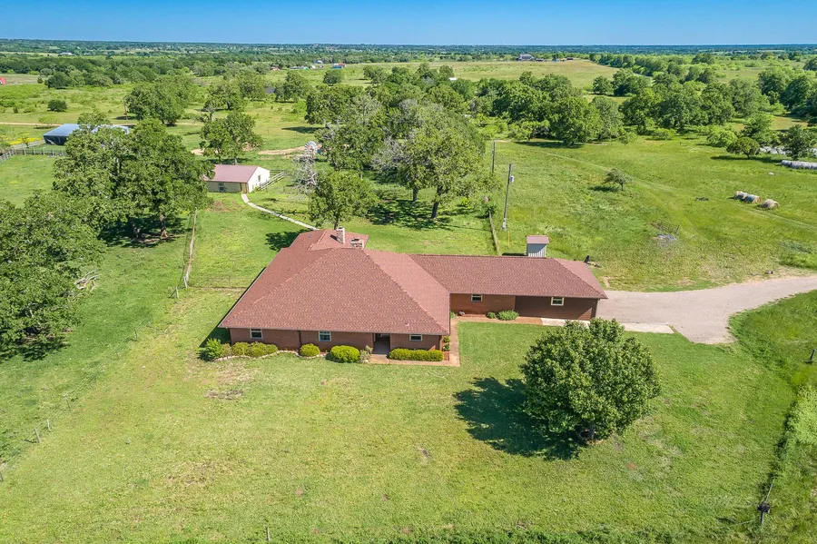 36x52 Barn and wood cattle working pens. Decorative Windmill behind house. Chain-link fence around house to keep pets in. Perimeter fenced and cross-fenced for cattle. Scattered Post Oak trees.