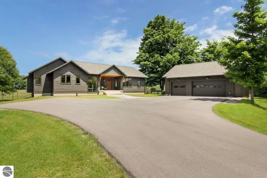 Twin maples as it is known, is a spectacular custom home near Leland with shared access on North Lake Leelanau. If you enjoy open space, privacy and a big-sky view this beauty is for you. The unobtrusive architecture appears to have been born of the land. With one-level living and an abundance of natural light youll enjoy views from every room. The living area features a gas fireplace. In the kitchen youll find, soapstone and marble counters, Bertazzoni dual fuel range and oven. The master suite is spacious, the master bath has radiant floor heat, a tiled walk-in shower, tile floors and a stone vanity. Theres a reading room and an office. All of the cabinetry and built-ins are custom. A wide staircase leads to cozy lower level ideal for family and friends. Aesthetic elements include, 9-ft ceilings, a palette of soft colors, solid cherry floors and doors with a matte finish, cork floors, ...
