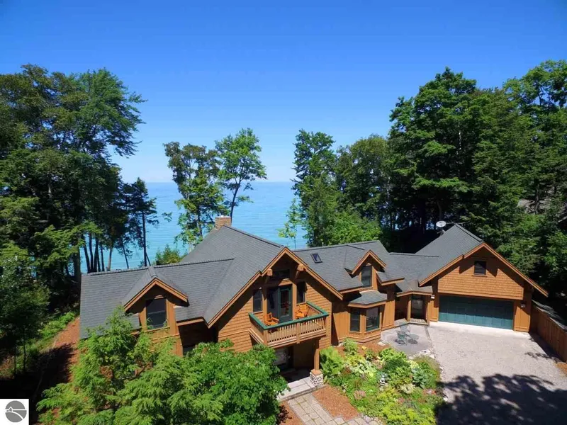 Through a magnificent forest, at the end of a long winding road is where youll find 426 feet of sand beach on Lake Michigan, views of four islands, seven acres with a custom main house, a vintage cabin, and a flowing stream that can all be yours today. Located between Leland and Northport, this property has been owned by the same family for more than 80 years. The main house is craftsman style, with one level living, an open floor plan, a main level master suite; a laundry mudroom leading to the two car garage; a full bath off the hall; great kitchen layout with a stainless island, a walk-in pantry, and of course beautiful lake views at every turn. On the upper level youll find two guest rooms and full bath. A notable feature between the guest rooms is the open loft, flexible space with a lake view to the west, and a balcony to the east. Designed by the architect owner, and built by Easl...