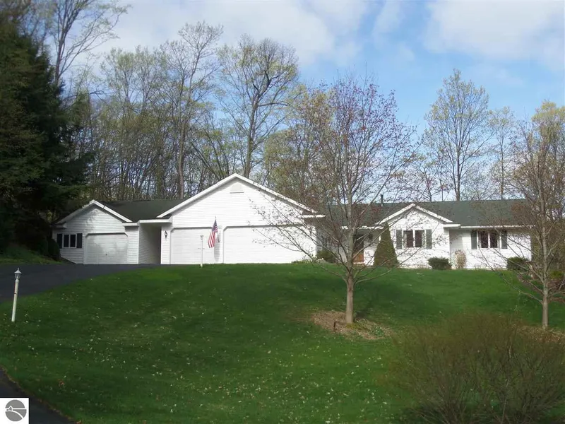 Perfectly located just 6 miles North of Traverse City in beautiful Leelanau County on a pristine and private wooded setting. As you enter the foyer from the covered front porch you'll be overlooking a large freshly painted living room with high ceilings and a gas log fireplace. The picture window looks out over the private back yard and a gorgeous champion dogwood tree that shades a darling koi pond. The dining area opens out to the multi level decks. The spacious island kitchen has white appliances, corian tops, new dark pulls on the cabinetry, a veggie sink in the island, and a breakfast bar. The main floor master has a private bath with large his and her closets & sinks, along with a private balcony overlooking the back yard where you can sit and enjoy the calming sounds of trickling water into the pond. You'll appreciate the wide hallways and solid wood doors. Downstairs is a large family room with another gas fireplace, a studio which could serve as bedroom #4, a 3rd full bath, a sizable craftsman's workshop and plenty of storage space. The basement has back stairway to the heated garage so projects don't have to come through the house. The garages offer storage for 4.5 vehicles, a utility sink and built in shelving. Outdoors you'll find lush perennial floral landscaping and just down the street are shared tennis & pickle ball courts.