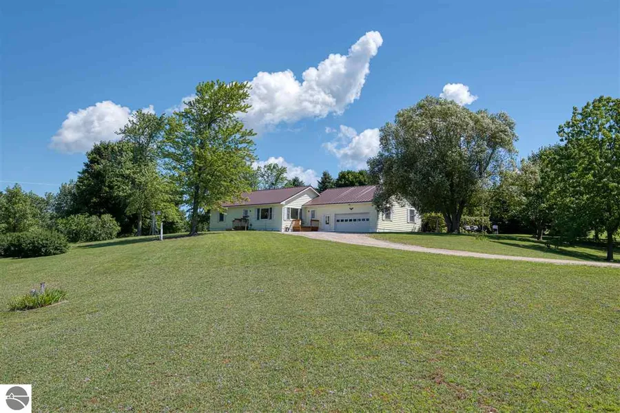 Close to town Leelanau County ranch home on 5 acres, zoned AG with multiple garden areas and immaculate landscaping. This home and acreage have been in the same family for decades and features a spacious open living area, main level laundry, large mudroom and oversized garage with workshop area. The lower level is really set up as an in-law suite, complete with family room, wet bar, 3rd non-conforming bedroom, bath, hobby room and loads of storage and bonus 2nd stairwell for direct garage access. Two furnaces provide wood or propane (new 2015) heating options. Room to grow, outbuildings allowed and encouraged!