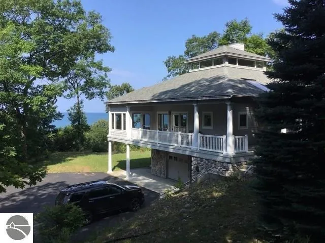 Stunning views of Lake Michigan, the Manitou Islands and breathtaking sunsets highlight this beautiful Monticello style home. The high ceilings and oak floors highlight the delightful floor plan. You will love the 3 season room and colonnaded wrap around porch. The open floor plan with kitchen, dining area and living room makes for comfortable yet elegant living. There is a gas stone fireplace in the living area. The larger master bedroom overlooks Lake Michigan and it includes a private master bathroom. Located near Leland, beaches and wineries and ready for you to enjoy.