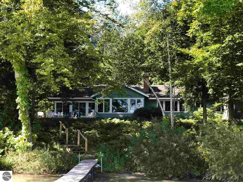This is quite a find. The location is just 1.6 miles N. of Leland and boasts 180' of sand frontage on North Lake Leelanau with a beautiful setting of mature trees, expansive lake view and privacy from the road. This attractive classic 50's cottage has the feel of Leland summers and the quality they built back then. The property and house has 2.25 acres with privacy from the road, clear fir paneling, spacious living area with vaulted ceiling, fireplace and large windows to take in the lake view, hardwood floors, primary bedroom with private bath and fireplace, 3 season sunroom, lakeside deck and guest house with bath.