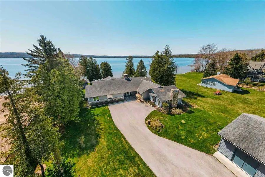 Welcome to the ultimate West Side, S Lake Leelanau address with sunrise views and gorgeous frontage! This beautifully updated, contemporary ranch is offered with 5 bedrooms, 3 full bathrooms with heated floors, office, guest wing, 2nd family room, wet bar, 2 fireplaces, all on one floor! Customized throughout, check out these finishes, metal mantel, top of the line finishes throughout. Central air in part of the home, mix of propane and electric heat. Storage options for your toys with a 42' X 42' pole barn, 2 car garage with attached workshop and a boat house on the lake. Natural Gas on Sandbar (Under 200' free,Up to 250' $450,Up to 300' $1350). This 1.88 acre lot offers options to recreate outside, situated on a quiet private road in a peaceful rural setting. Mature landscaping complete with irrigation, sandy bottom frontage, lake side patio, custom iron firepit and much more. Extensiv...