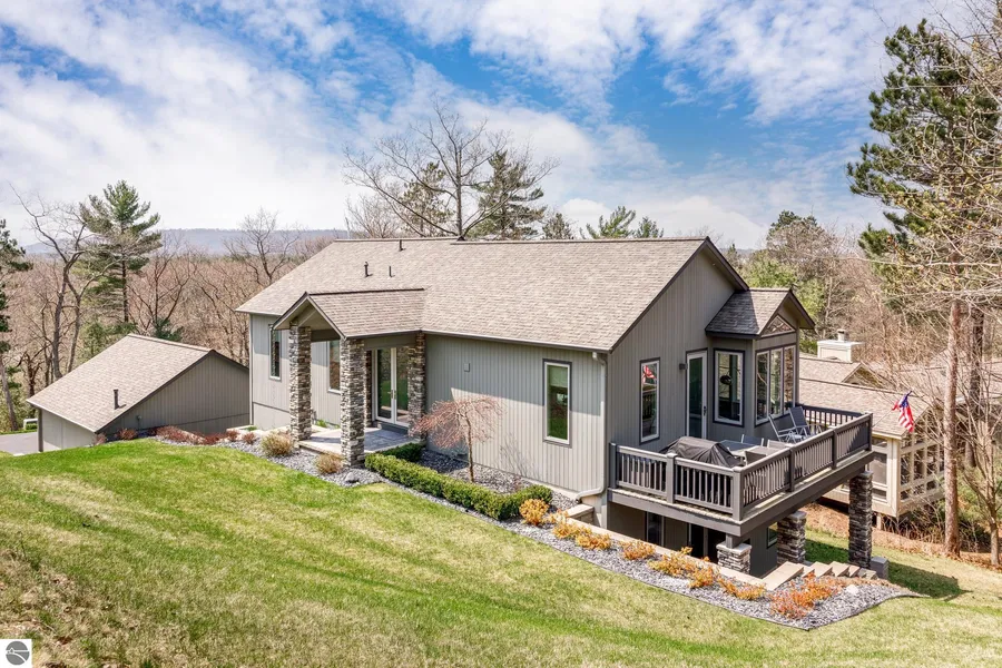 Absolutely stunning contemporary home nestled into the heart of The Homestead America's Freshwater Resort. Designed by a well-renowned, New York based architect, this 2017 build boasts nearly 3,000 square feet of high-end finishes and incredible architecture. The main level features a master suite, 4 season glass sunroom, double sided gas fireplace and open concept living/dining area. Love to cook and entertain? The spacious kitchen features Monogram built-in appliances, stone countertops and Italian made Scavolini cabinetry all hand assembled by the factory on site. The breathtaking Cherrywood imperial staircase is the star of this home. Complemented by floor-to-ceiling seamless glass windows, the staircase leads to the lower living quarters. 2 generous bedrooms, full bathroom, kitchen, dining and living area make this lower level the perfect retreat for family or guests. The lower level has front and rear entrance points and a private patio. The home is extremely energy efficient with Pella doors and windows throughout. The perimeter of the home is methodically landscaped with paver stone pathways, patios, stairs, columns and retainer walls. The property is only lived in 6 months out of the year and is meticulously maintained. The main floor office could serve as a fourth bedroom. The lower level exercise room would offer a non-conforming fifth bedroom. Although the home has never been rented, it has tremendous rental potential. A short walk to Lake Michigan, restaurants, shops and bike trails. Check out our 3D virtual tour and have a click? around this one-of-a-kind Homestead beauty.