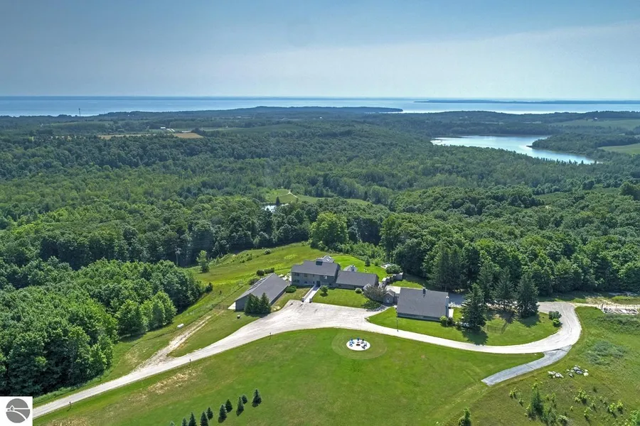 In the heart of the Leelanau Peninsula, on a hilltop with a gradual rise from the road is Woodcliff. This one owner estate built and expanded over time, enjoys brilliant views in all directions Bass Lake, Grand Traverse Bay and the Stony Point Peninsula; Northport Bay and Northport Point; and on a clear day all the way to Charlevoix. Woodcliff, nestled on 30.85 acres, consists of a 5,033 sq. ft., 5-bedroom, 5-bath Main House; an attached fully functional 3,228 sq. ft., 3-bedroom, 3-bath Guest House/in-law suite; an 18'x36' indoor pool enclosed in a 40 x 72 sky lit building; a waterfall pond, decks and patios, natural landscaping; a 40 x 60 pole building---and privacy. Extras include: an elevator, 2 fireplaces, custom kitchen, Amdega conservatory, lots of built-ins, fenced dog run. For details please see the Features Overview and Survey. Stocks go up. Stocks go down. But Woodcliff tenders value for a lifetime.